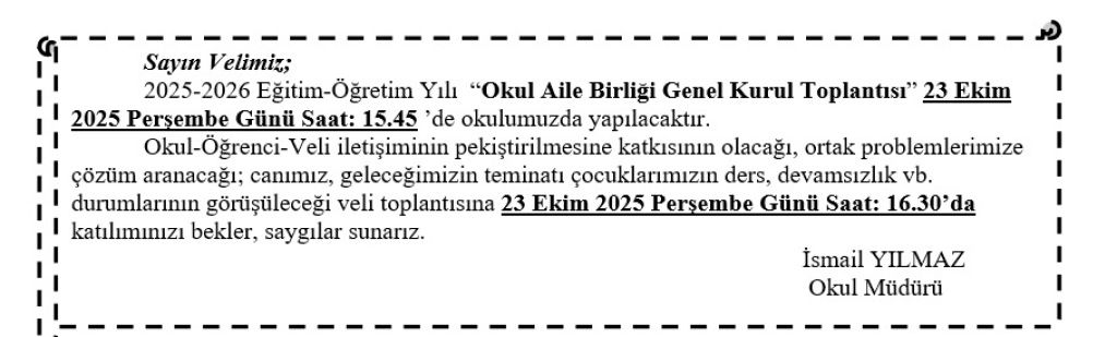 Ayrıca yine 23.10.2025 Perşembe günü Veli toplantısı 16.30'da gerçekleştirilecektir.